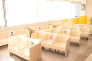 待合室での3密を避けるために、椅子の間隔を空けるように3人掛けのソファの真ん中に動物たちを座らせています。
